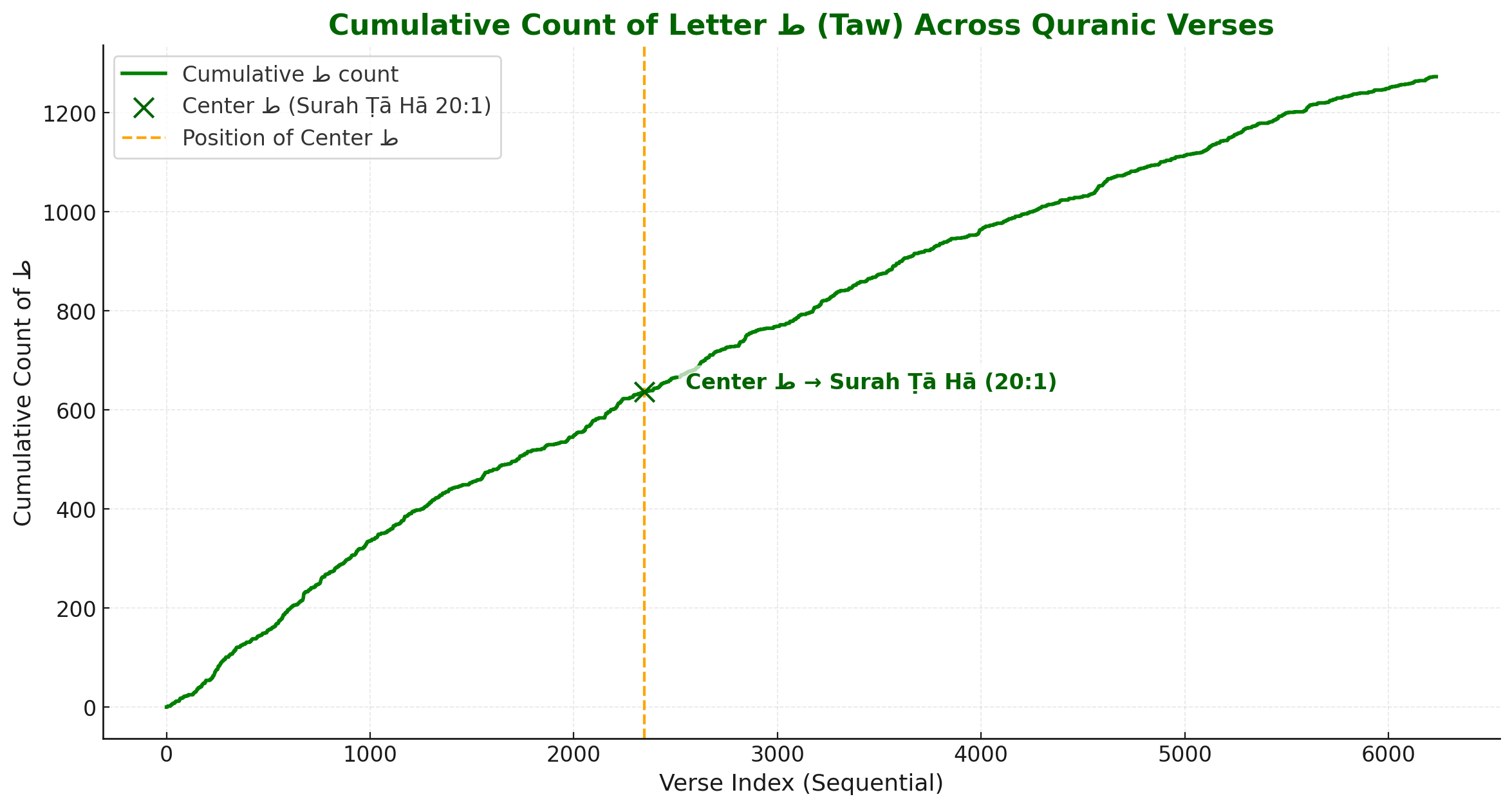 The cumulative plot of ط (taw) shows a smooth, balanced rise across the Quran, with the center ط perfectly aligned at Surah Ṭā Hā (20:1).